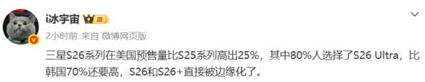 【CNMO科技消息】3月11日,博主“i冰宇宙”发文称,三星S26系列在美国市场的预售量比S25系列高出25%,其中80%人选择了S26 Ultra,这一数据甚至超过了韩国市场的70%。