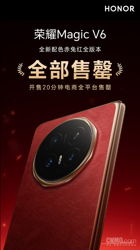 【CNMO科技消息】近日,荣耀全新折叠屏旗舰Magic V6正式发布,起售价为8999元,其凭借极致轻薄、超长续航与全能配置迅速引爆市场。开售后仅20分钟,荣耀Magic V6全新配色赤兔红全版本在电商全平台便宣告售罄,人气异常火爆,成为马年折叠屏市场的热门之选。